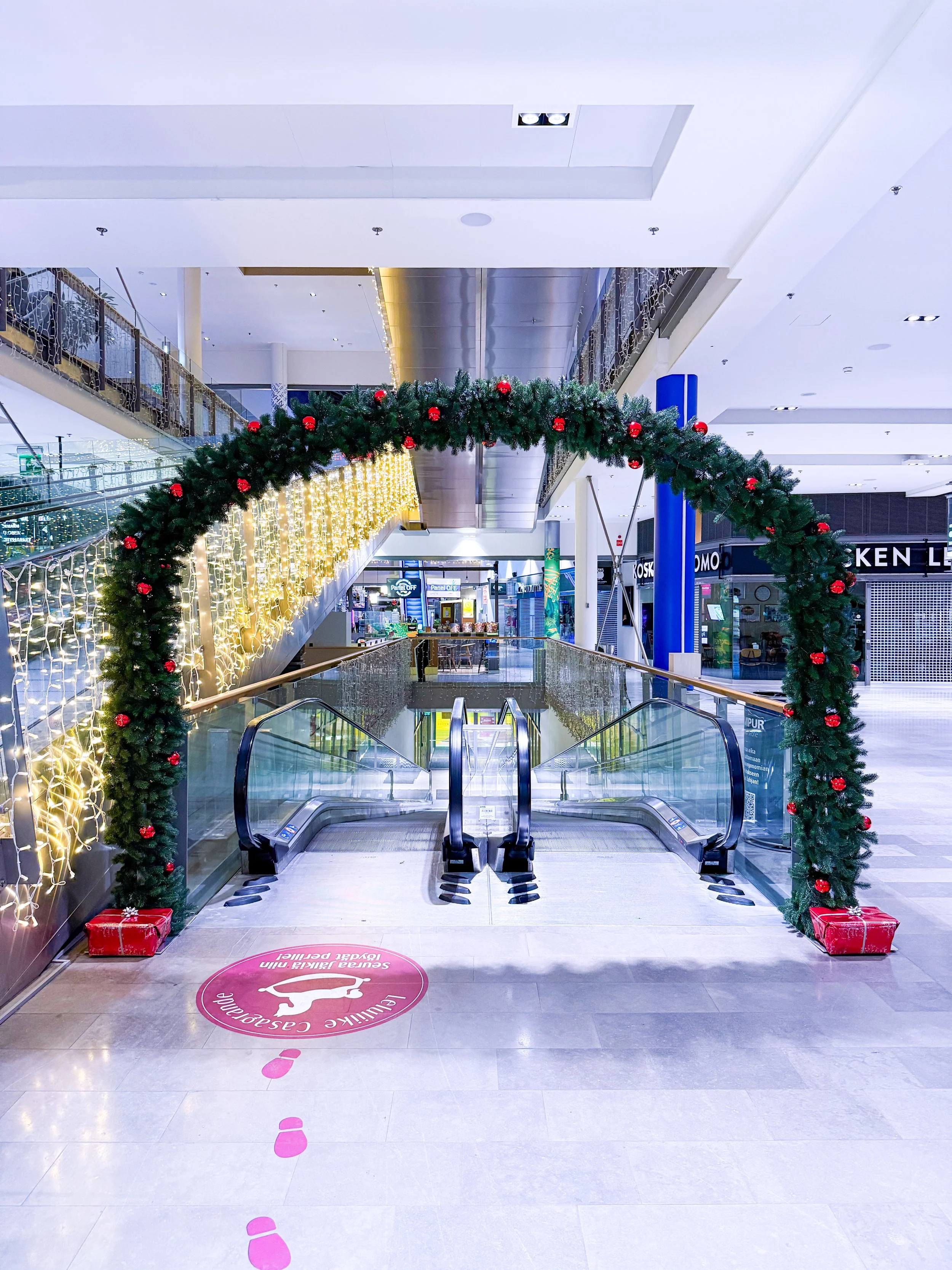 Yli 300kpl joulupalloja ja niiden asennus kauppakeskuksen käytävien kattoihin